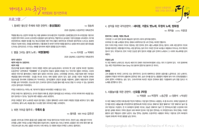 이날 음악회는 경상북도 도립국악단 이정필 상임지휘자의 총괄지휘에 맞추어 코로나19로 심신이 지친 경북도민과 고령군민께 희망과 용기를 주는 메시지를 담고 있는 곡으로 구성했다.