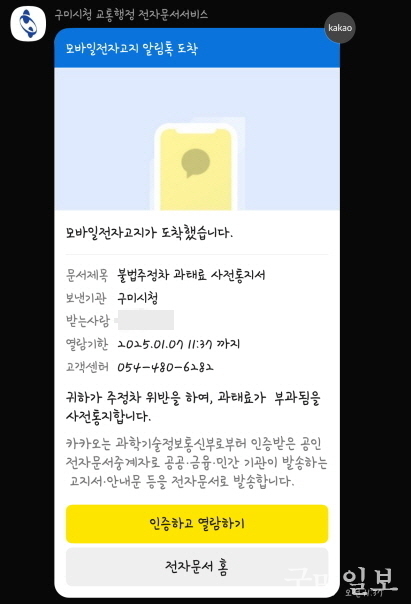 구미시는 올해 1월부터 모바일 전자고지 시스템을 시행한다. 이 서비스는 기존 등기우편으로 송달되던 종이고지서를 대신해 카카오톡과 네이버 알림을 통해 전자문서를 본인 명의의 스마트폰으로 전송하는 방식이다.