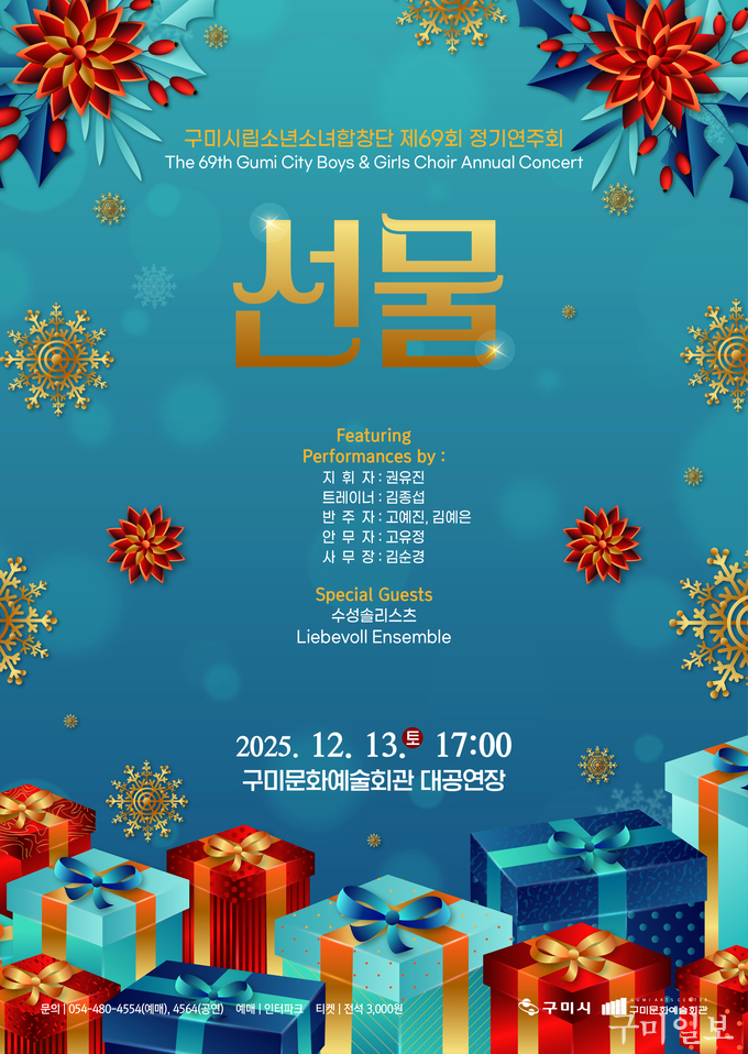 마지막으로 12월 13일 구미문화예술회관 대공연장에 개최 예정인 제69회 구미시립소년소녀합창단 정기공연 「선물」은 희망과 따뜻함을 전하는 주제를 아이들의 아름다운 목소리로 나타낼 예정이다.