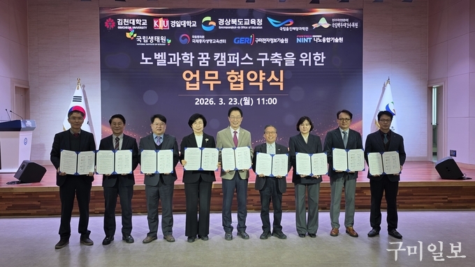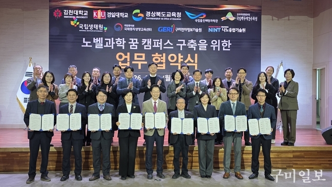 김천대학교(총장 윤옥현)는 23일 경상북도교육청(교육감 임종식)을 비롯해 경일대, 국립울진해양과학관, 국립백두대간수목원, 국립생태원 멸종위기종복원센터, 국립종자원, 국제종자생명교육센터, 구미전자정보기술원, 포항공대 나노융합기술원 등 9개 기관과 ‘노벨과학 꿈 캠퍼스’ 운영을 위한 다자간 업무협약을 체결했다.
