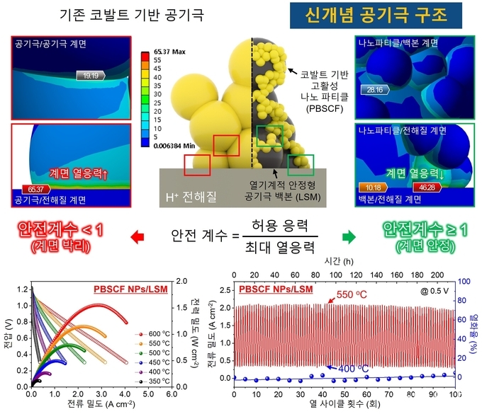 나아가 연구팀은 ANSYS 기반 열응력 해석(Thermal stress analysis)을 통해 LSM backbone이 공기극과 전해질 사이의 열팽창 불일치를 효과적으로 완화함을 검증했다. 특히, 열응력에 대한 공기극/전해질 계면의 안정성 지표로 안전 계수(Safety factor) 개념을 새롭게 도입해, 온도 변화에도 기계적인 결함 발생 없이 안정적인 구동이 가능한 최적의 소재 조합 및 미세구조 설계에 대한 실질적인 설계 가이드라인도 함께 제시했다.