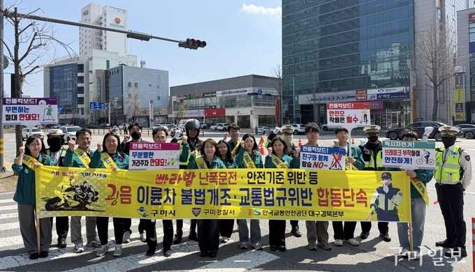 구미경찰서(서장 유오재)에서는, 2일 송정동 일대에서 이륜차 소음, 불법 구조변경(튜닝) 등 불법행위 근절을 위해 한국교통안전공단 대구경북본부, 구미시청 교통정책과, 환경관리과, 차량등록사업소 등 총 20명이 투입되어 대대적인 이륜차 합동단속을 실시하였다.