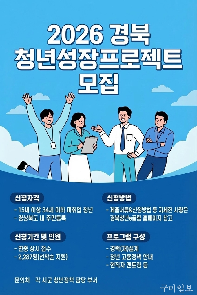 경상북도는 이번 사업으로 도내 청년 2,300명을 지원할 계획이다. 참여를 희망하는 청년은 경북청년e끌림 홈페이지(gbyouth.go.kr)에서 시·군별 모집 일정을 확인해 신청할 수 있으며, 자세한 사항은 해당 누리집 또는 각 시․군 청년 정책 부서를 통해 안내받을 수 있다.
