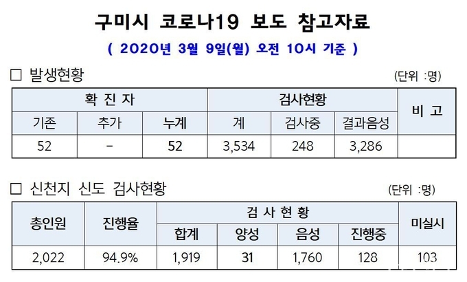 구미시(시장 장세용)에서는 언론보도 참고자료를 통해 2020년 3월 9일(월) 오전 10시 기준, 코로나 19 확진자는 총 52명으로 추가 확진자는 없으며, 현재 검사중인 인원은 248명임을 밝혔다.