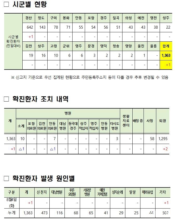 경상북도, 2020년 8월 4일(화)「코로나19」발생 현황