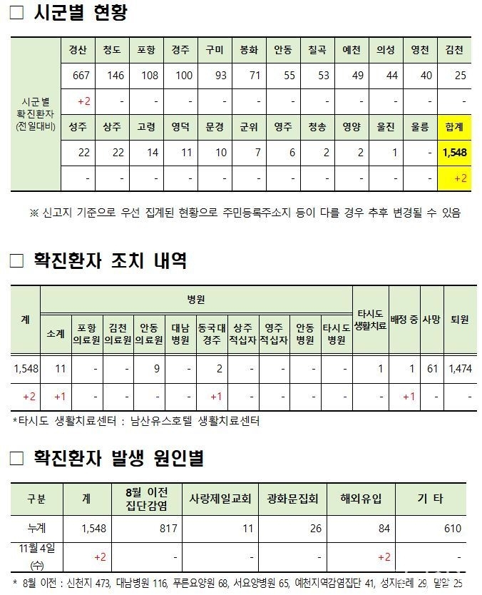 10월 17일(토) 인천공항 도착 → 경산보건소 검사(미결정) → 11월 1일(일) 손자확진으로 동국대경주병원 동반입원 → 11월 3일(화) 접촉자 검사 → 확진판정(동국대경주병원 입원)