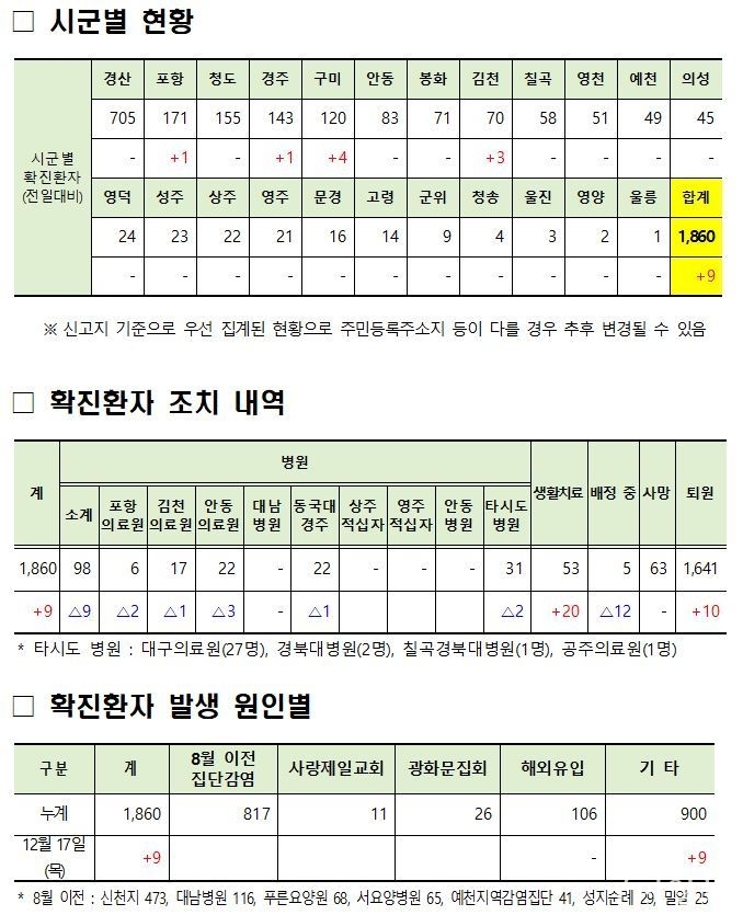 경상북도는 12월 17일(목) 0시 기준 코로나19 국내감염 9명이 신규 발생했다고 밝혔다.