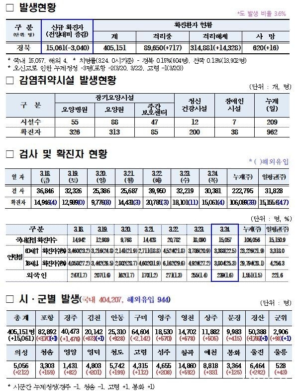 경상북도에서는 3월 24일(목) 23개 시·군(시 10, 군 13)에서 코로나19 확진자 국내감염 15,061명, 국외감염 4명이 신규 발생하였다.