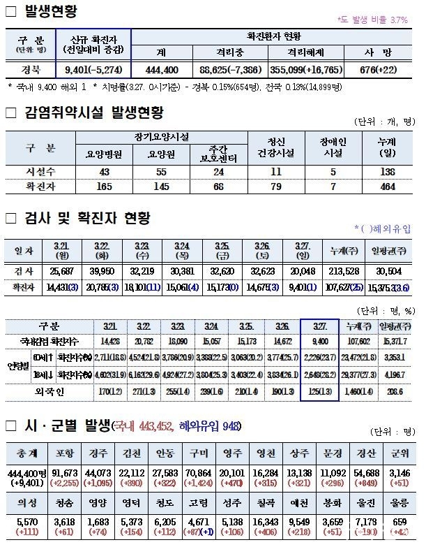 경상북도에서는 3월 28일(월) 0시 기준 23개 시·군(시 10, 군 13)에서 코로나19 확진자 국내감염 9400명, 국외감염 1명이 신규 발생했다.