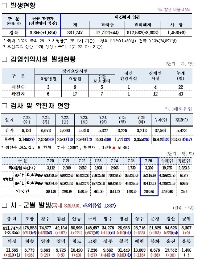 경상북도에서는 7월 26일(화) 0시 기준 22개 시·군(시 10, 군 12)에서 코로나19 확진자 국내감염 3,326명, 국외감염 29명이 신규 발생하였다.
