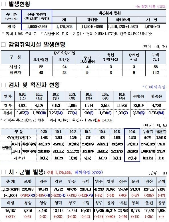 경상북도에서는 10월 6일(목) 0시 기준 22개 시·군(시 10, 군 12)에서 코로나19 확진자 국내감염 1,893명, 국외감염 7명이 신규 발생하였다.
