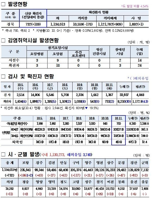 경상북도에서는 10월 11일(화) 0시 기준 22개 시·군(시 10, 군 12)에서 코로나19 확진자 국내감염 730명, 국외감염 2명이 신규 발생하였다.