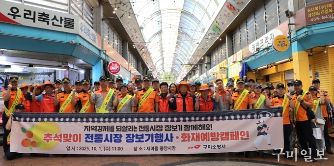 구미소방서(서장 조유현)는 10월 1일(수) 추석 명절을 앞두고 원평 새마을 중앙시장에서 ‘전통시장 장보기 행사’와 ‘화재예방 캠페인’을 실시했다.