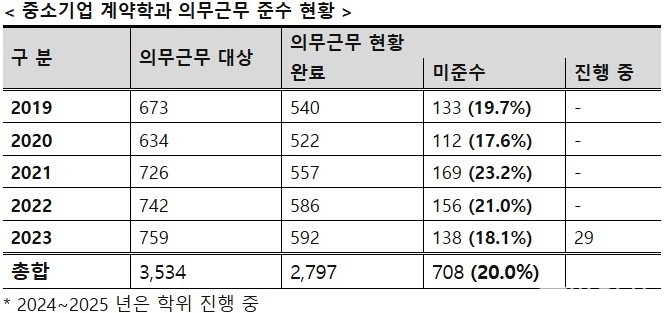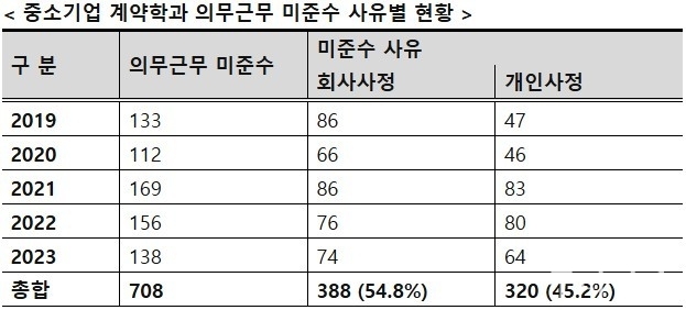 구자근 의원이 중기부와 중소벤처기업진흥공단으로부터 제출받은 자료에 따르면 2019~2023년 5년간 졸업 이후 의무근무 대상 3,534명 중 708명(20.0%)이 의무근무 기간을 준수하지 않고 학위만 취득 후 퇴사한 것으로 밝혀졌다. 사업에 참여하는 대상은 학위취득 후 참여 유형에 따라 1~2년 동안 해당 업체에 의무적으로 근무해야 한다.