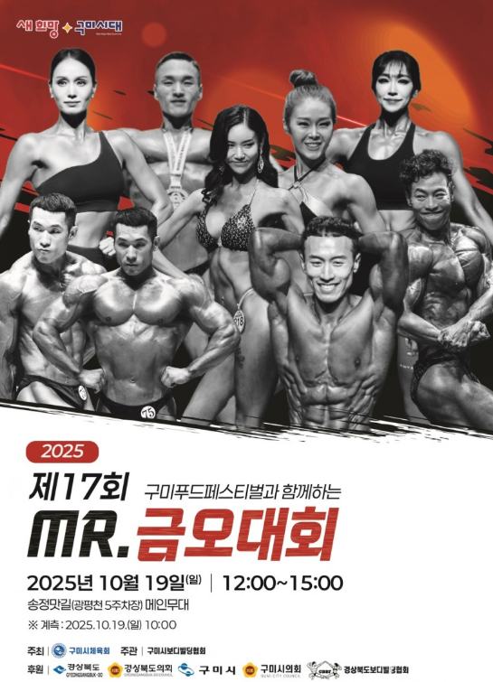 구미시는 10월 19일(일) 송정맛길(광평천 5주차장) 메인무대에서「제17회 미스터 금오대회」를 개최한다. 이번 대회는 ‘맛있는 건강, 건강한 열정’을 주제로 2025 구미푸드페스티벌과 연계하여 스포츠와 미식이 어우러진 특별한 축제로 진행된다.