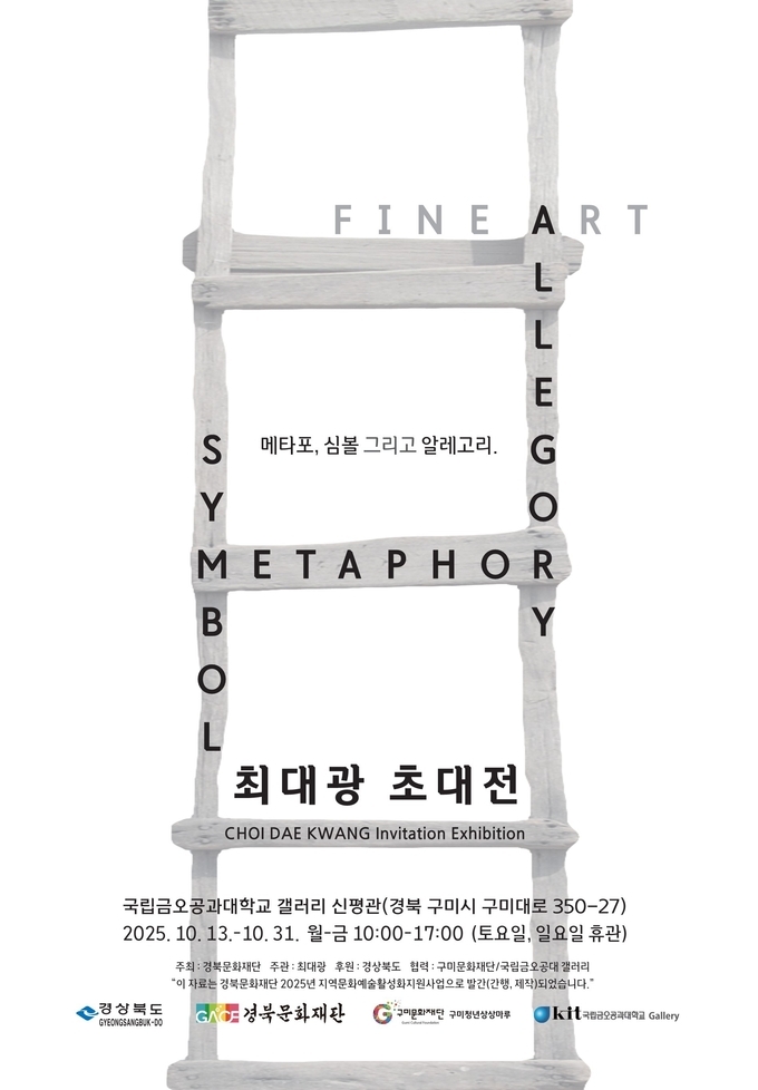 (재)구미문화재단(대표이사 이한석)은 국립금오공과대학교와 협력하여 진행하고 있는 ‘구미청년상상마루 1기 입주작가 릴레이 전시’의 마지막 순서로 최대광 작가의 두 번째 초대전 <메타포 심볼 알레고리>를 개최한다고 밝혔다.