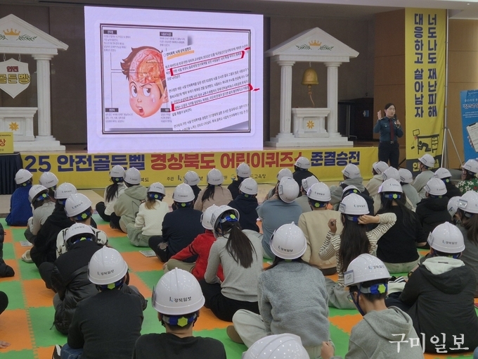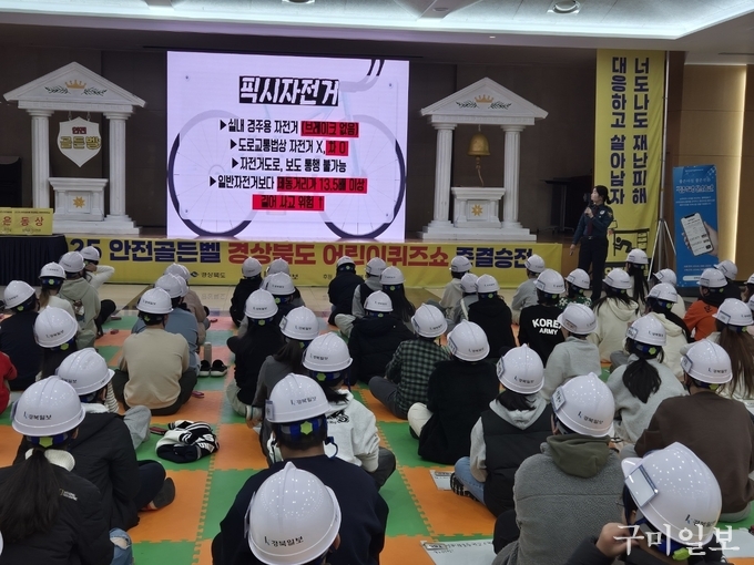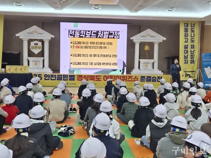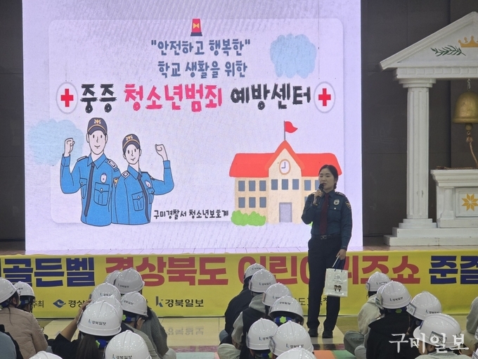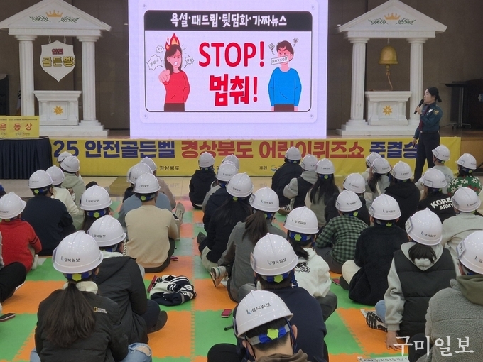구미경찰서(서장 유오재)는 11월 27일(목) 구미상공회의소 대강당에서 열린 ‘2025 안전골든벨 경상북도 어린이퀴즈쇼’ 준결승 현장에서 3권역(구미‧김천‧성주‧의성‧상주) 초등학생 4~6학년 116명이 참여한 가운데 맞춤형 범죄예방 교육을 실시했다. 이날 현장에는 뒷자리에서 자녀를 응원하는 학부모들도 함께 참관하여 행사의 열기를 더했다.