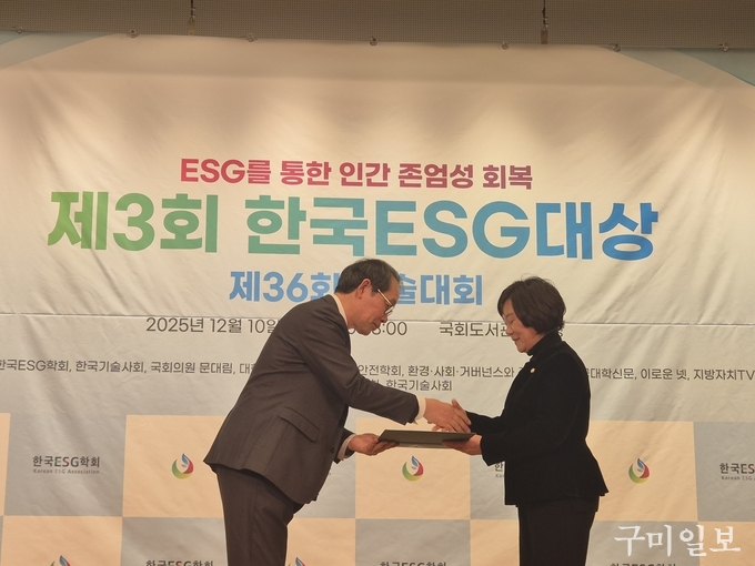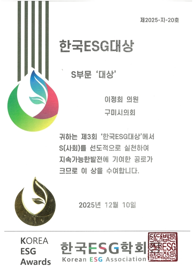 이정희 구미시의회 의원(국민의힘, 비례의원)은 10일 국회도서관에서 열린 ‘제3회 한국ESG대상’ 수상식에서 사회(S) 부문 ESG 대상을 수상했다.