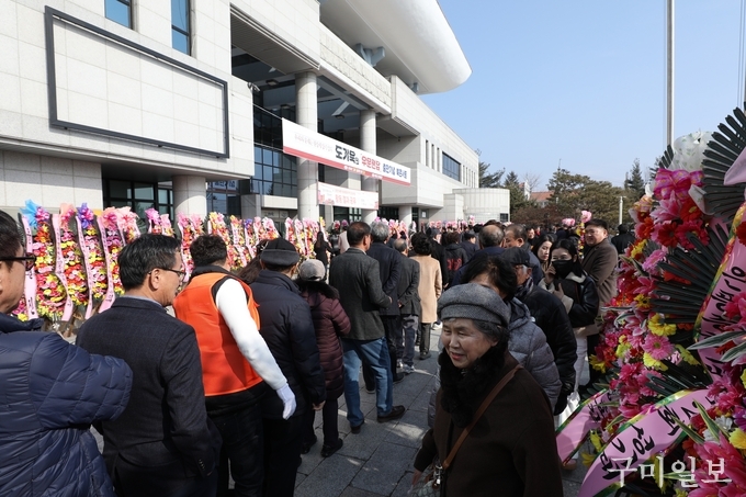객석과 로비가 발 디딜 틈 없이 채워진 가운데 1·2층 통로까지 인파가 이어졌고, 건물 주변에는 축하 화환 5백여 개가 늘어선 채 인근 도로에 차량 행렬이 길게 이어지며 예천 도심이 종일 북새통을 이뤘다.