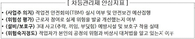 차등관리제는 50인 미만 사업장을 대상으로 사업장의 안전보건 역량을 평가하여 상·중·하 3단계로 분류하고, 그 등급에 따라 관리 방식을 달리 적용하는 데 있다. 상대적으로 안전관리가 취약한 50인 미만 사업장에 대해 차등관리제를 우선 실시하고, 향후 사업장 규모를 단계적으로 확대할 방침이다.