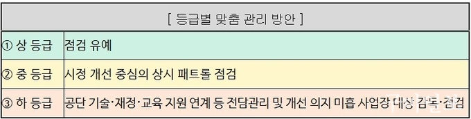 평가 결과에 따라 안전관리가 우수한 “상 등급” 사업장은 점검을 유예받고, “중 등급” 사업장은 시정 개선 우선 목적으로 상시 패트롤 점검 대상이 된다. “하 등급” 사업장에 대해서는 안전관리 수준 향상을 위한 기술·재정을 우선 지원하되, 개선 의지가 없는 사업장은 철저한 수시 감독을 실시할 계획이다.