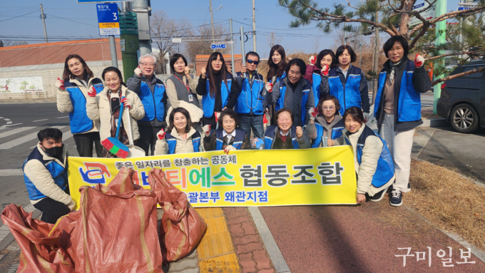 EBTS협동조합 왜관지국(지국장 김정호) 조합원 20여명은 지난 2월 13일, 사무실 인근 도로와 인도, 쉼터 주변을 중심으로 환경정화 봉사활동을 진행했다.
