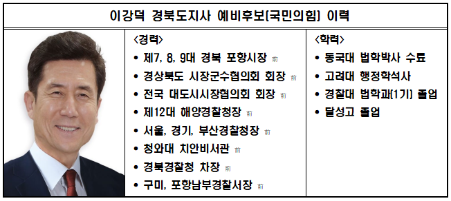 이 예비후보는 “광역의원 수 감소는 단순한 숫자의 감소가 아닌 지역 대표성의 문제”라며 “인구가 적은 경북 북부권과 동해안, 울릉도는 직격탄을 맞게 될 것이 불을 보듯 뻔하다”고 강조했다.