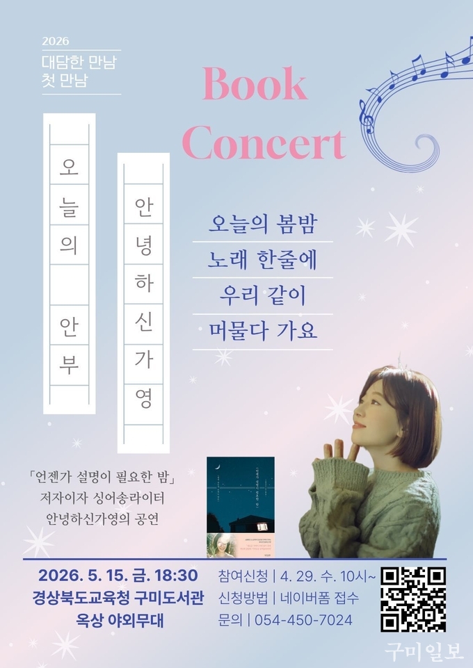 경상북도교육청 구미도서관(관장 최선지)은 오는 5월 15일(금) 오후 6시 30분, 도서관 옥상 야외무대에서 대담한 만남 북콘서트 「오늘의 안부, 안녕하신가영」을 개최한다고 밝혔다.