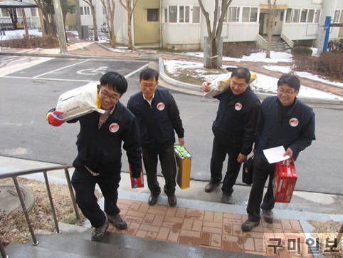 2일차(2/6) 한국전력공사 구미지사에서 이병호 지사장, 김의규 구미지회위원장 외 9명이 참여하여 지역 내 독거노인세대 10세대 각 쌀 20kg , 라면 1박스 후원 및 직접 방문하여 정서적 서비스를 제공하였으며 전구교체와 점검까지 지원하였다.