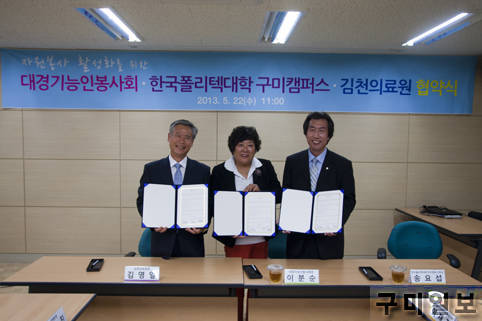 한국폴리텍대학 구미캠퍼스(학장 송요선)와 대경 기능인 봉사회(회장 이분순) 경상북도 김천의료원(원장 김영일)은 5월 22일 상호지원 업무협약을 체결하고 자원봉사에 관련한 업무협조 및 정보교환을 위한 상호지원 협력을 강화해 나가기로 했다.