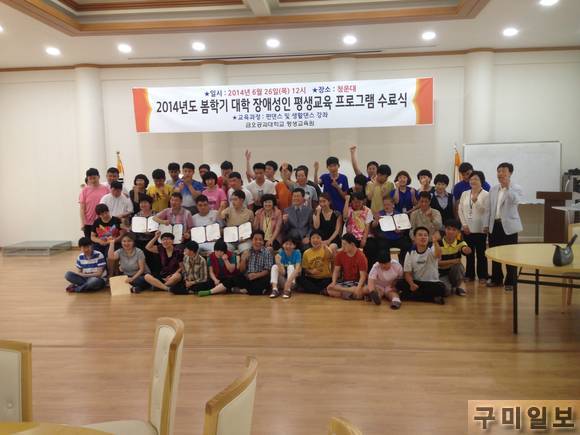 금오공과대학교(총장 김영식) 평생교육원(원장 신호균)은 6월 26일(목) 12시, 금오공대 청운대에서「2014학년도 봄학기 대학 장애성인 평생교육 프로그램 수료식」을 가졌다.