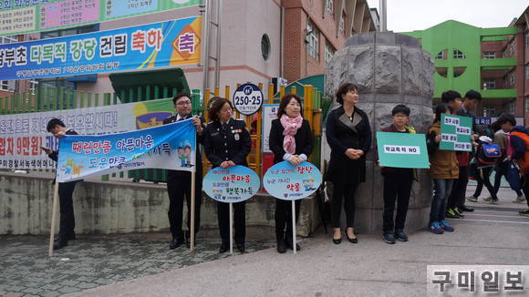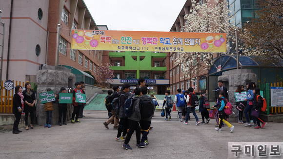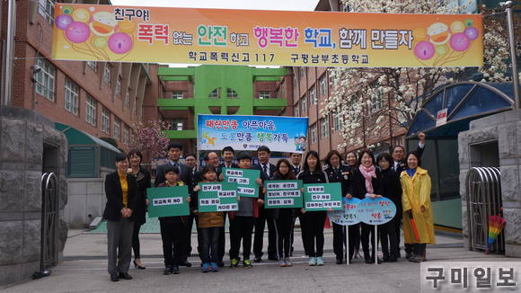 구평남부초등학교(교장 우영하)는 구미경찰서와 합동으로 4월 7일(화) 오전 8시부터 8시 30분까지 구평남부초등학교 교문에서 전교학생회 임원, 교직원, 구미 경찰서 경찰관 및 녹색어머니회 대표와 함께 폭력 없는 안전하고 행복한 학교를 만들기를 위한 ‘학교폭력 멈춰’ 캠페인을 실시했다.