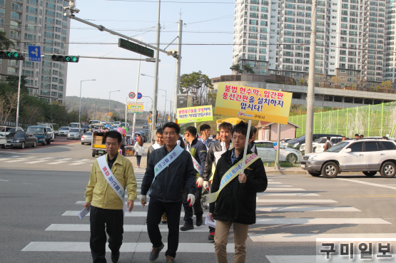 구미시(시장 남유진)에서는 구미경찰서, (사)경상북도 옥외광고협회 구미시지부(지부장 김재돈)와 합동으로 불법 광고물 민․관 합동단속 및 캠페인을 2015. 4. 10(금) 오후 4시부터 2시간 동안 50여명이 참여한 가운데 실시하였다.