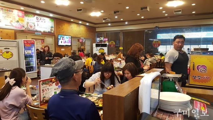 마치 대형마트의 진열장처럼 준비된 삼겹사랑 인동점의 셀프코너는 다양한 야채와 밑반찬 그리고 먹음직스러운 고기들이 진열돼 있고 셀프코너 앞은 사람들의 움직임이 더욱 바빠 보인다.