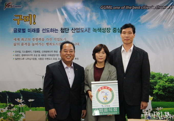 구미시(시장 남유진)는 지난 2016. 10. 21. 구미시외식지부회의실에서 올해 신규로 지정한 모범음식점 영업주가 참석한 가운데 간담회를 개최하였다. 이날 간담회에서는 지정서와 표지판을 전달하고, 모범음식점 영업주가 지켜야 할 사항에 대한 교육 순서로 진행되었다.