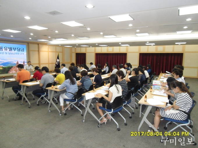 구미시(시장 남유진)는 지난 2017. 8. 4(금) 시청 3층 상황실에서 2017년도 교통유발부담금 부과대상 시설물에 대한 본격적인 조사를 시작하기 전 현장조사요원 등 40여명이 참석한 가운데 교통유발부담금 부과에 대한 지침시달 회의를 실시하였다.
