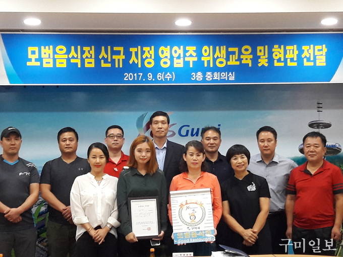 구미시(시장 남유진)에서는 지난 2017. 9. 6(수) 15:00 시청 중회의실에서 2017년 모범음식점 신규 지정 10개 업소에 대하여 위생교육을 실시하고 현판을 전달하였다.