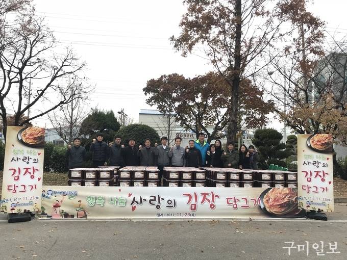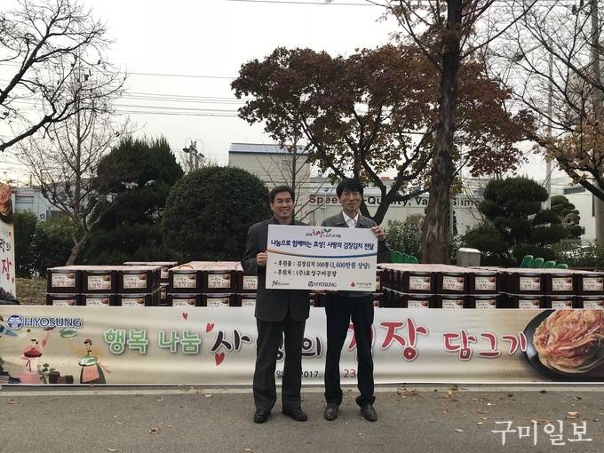 ㈜효성구미공장은 2010년부터 매년 구미공장만의 차별화된 봉사활동인 ‘사랑의 김장담그기’ 행사를 지속적으로 실시하고 있으며 자매결연 활동을 통한 지역 밀착형 사회공헌 실천을 위해 1사1교(도송중학교)에 장학금과 버스지원을 비롯하여 1사1산(천생산), 1사1하천(이계천)으로 자연정화 활동 및 어린이재단과 함께 산타원정대 행사 후원 등 다양한 봉사활동으로 지역사회에 공헌하고 있다.