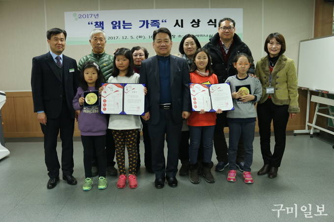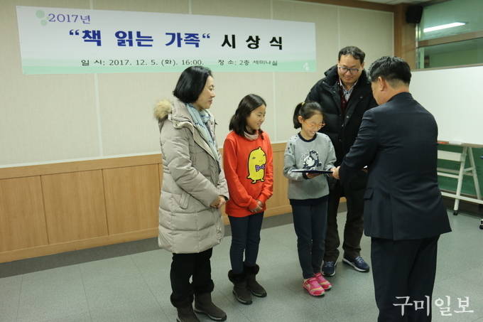 경상북도립구미도서관(관장 김유태)은 12월 5일(화) 2017년도 “책 읽는 가족”2가족을 선정해 인증서, 현판 및 문화상품권을 수여하는 시상식을 가졌다.