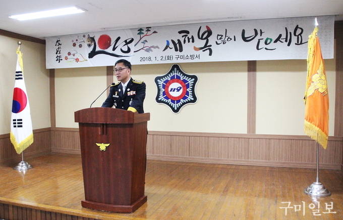 구미소방서(서장 전우현)는 1월 2일(화) 구미소방서 대회의실에서 2018년 시무식을 개최하고 새해 첫 업무를 시작했다.
