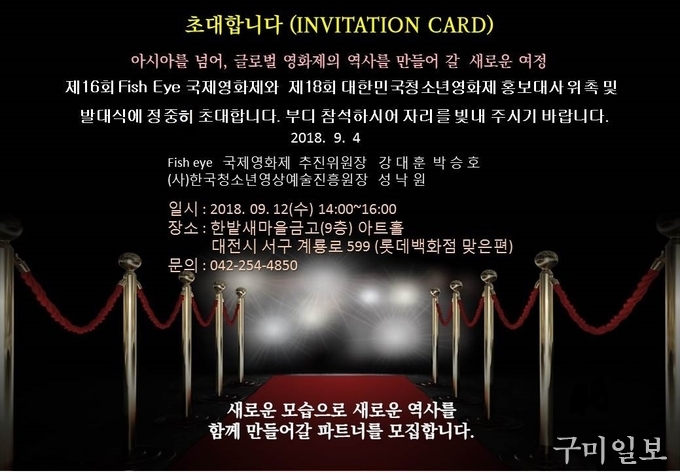 올해 11월 25일부터 11월 30일까지 6일간 대전에서 “매력- 영화로 마음을 잡다”란 슬로건아래 개최되는 제16회 fish eye 국제영화제와 제18회 대한민국청소년영화제 발대식 및 홍보대사 위촉식이 2018년 9월 12일(수) 오후2시 MG한밭새마을금고사옥(대전광역시 서구 계룡로 599. 롯데백화점 맞은편) 9층 아트홀에서 열렸다.