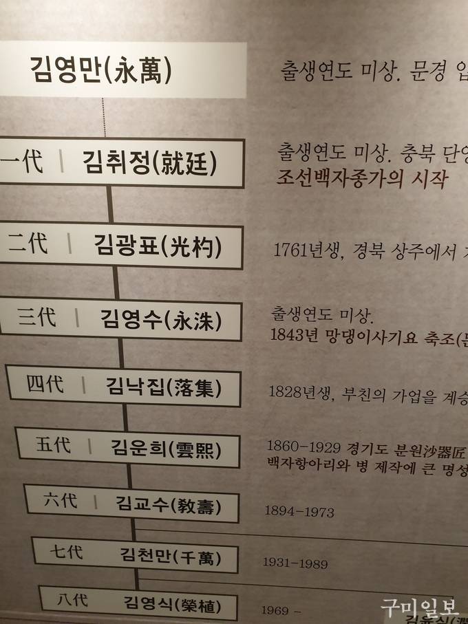 1989년 7대 도예가 선친 김천만의 사후 문산은 군복무를 마치자마자 집안의 종손으로 가업을 이어받아 선대에서 사용하던 조선백자를 그대로 재연, 고수함과 동시에 새로운 기법의 창조와 개발로 문경도자기를 넘어 세계 속의 도자기로 거듭나기 위해 오늘도 폭염 속에서 물레를 돌리고 있다.