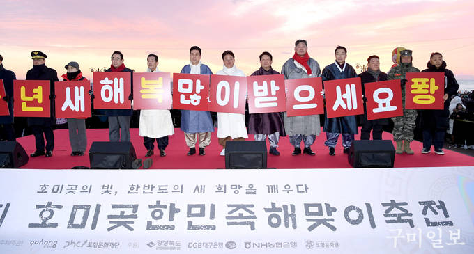 이철우 경상북도지사는 “가슴 가득 꿈과 희망을 품고 한반도의 새벽을 여는 호미곶을 찾아주신 시도민 및 관광객 여러분에게 감사드리고 경자년에는 소원했던 일들이 이루어지기를 바랍니다”라며 “대구시와 경상북도가 함께 지역 발전과 국운융성의 염원을 안고 2020년을 도약과 영광의 한 해로 만들어 나가자”고 신년메시지를 전했다.