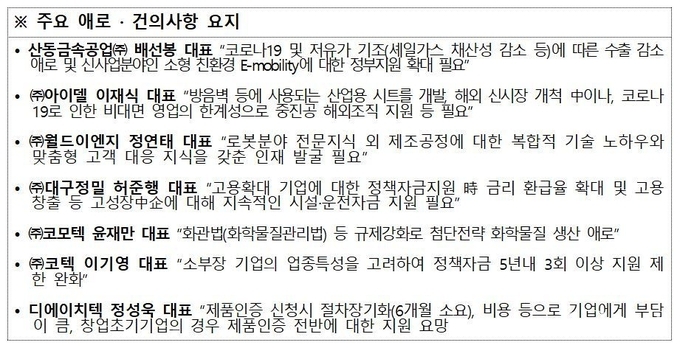 간담회 참석기업들은 독자적 기술로 코로나19 위기를 극복하고 글로벌 강소기업으로 성장 중에 있는 기업으로 상호 경영 노하우를 공유하고 기업들이 직면하고 있는 애로사항 건의를 통해 ‘포스트 코로나 대응’ 을 위한 현실적인 해결방안을 모색하였다.