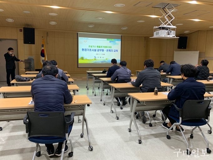 구미시(시장 장세용)는 2020년 11월 23일(월) 오후 2시 구미시 탄소제로교육관 다목적홀에서 구미시 환경기초시설 담당공무원 및 관계자를 대상으로 온실가스 배출권 거래제 대응 교육을 사회적 거리두기 지침을 준수하면서 안전하게 실시하였다.