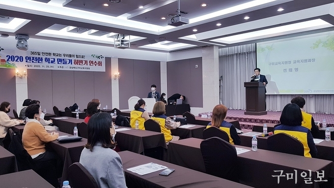 경상북도구미교육지원청(교육장 신동식)은 11월 25일(수) 호텔금오산에서 구미학생안전자원봉사자회(회장 임경희) 임원단과 구미시 초‧중등학교 대표 임원들을 대상으로 하반기 안전한 학교 만들기 연수회를 가졌다.