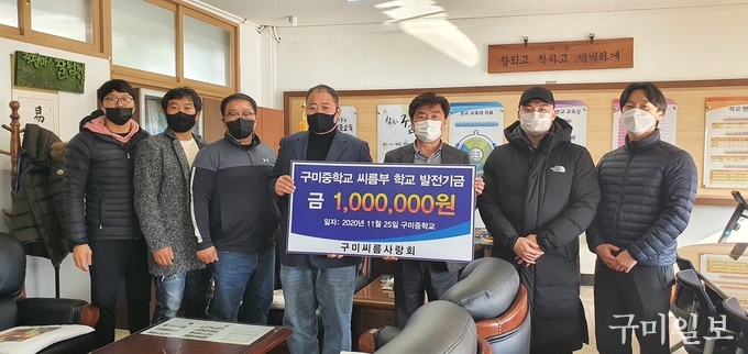 구미중학교(교장 민경두)는 지난 11월 25일(수) 교장실에서 발전기금 전달식을 개최하고, 구미씨름사랑회 임재용 회장으로부터 발전기금 100만원을 전달받았다.