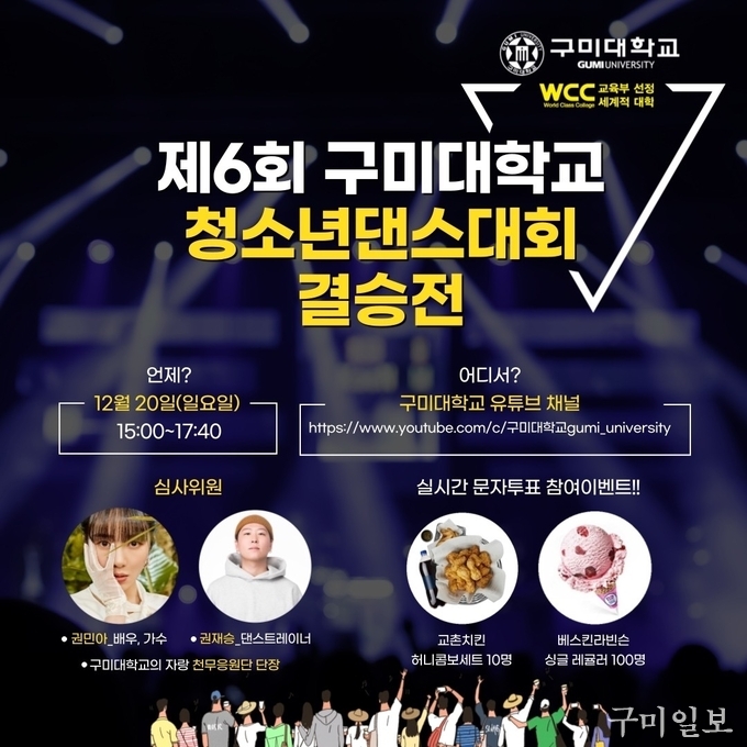 구미대학교(총장 정창주)가 ‘제6회 구미대학교 청소년 댄스대회’ 본선 결승을 온라인 생중계로 개최한다.