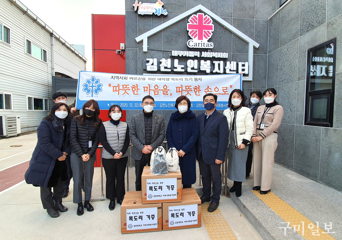 김천대학교(총장 윤옥현) 지역사회봉사센터에서는 지난 12월 22일(화) 코로나19 사태로 인한 대면 봉사활동의 어려움을 극복하고 지속적인 지역사회 나눔을 실천하기 위해 ‘따뜻한 마음을, 따뜻한 손으로’라는 봉사활동 프로그램을 기획하였다. 이번 봉사활동은 학교에서 뜨개질 실을 제공하고 학생들과 교직원들이 재능을 기부하여 한땀 한땀 정성을 다해 제작한 목도리는 김천 노인복지센터에 기탁하여 지역의 독거어르신들께 전달하도록 하였다.