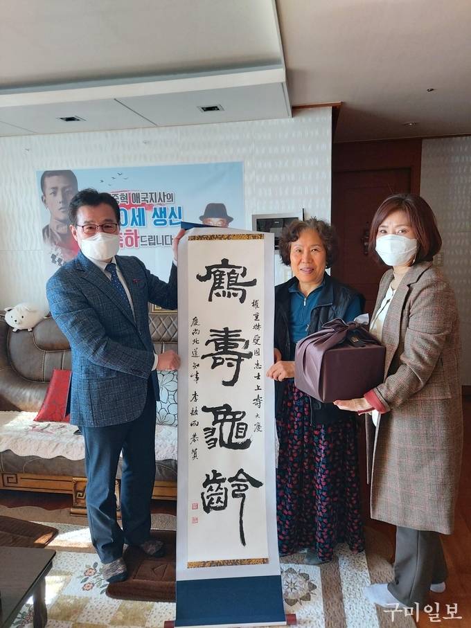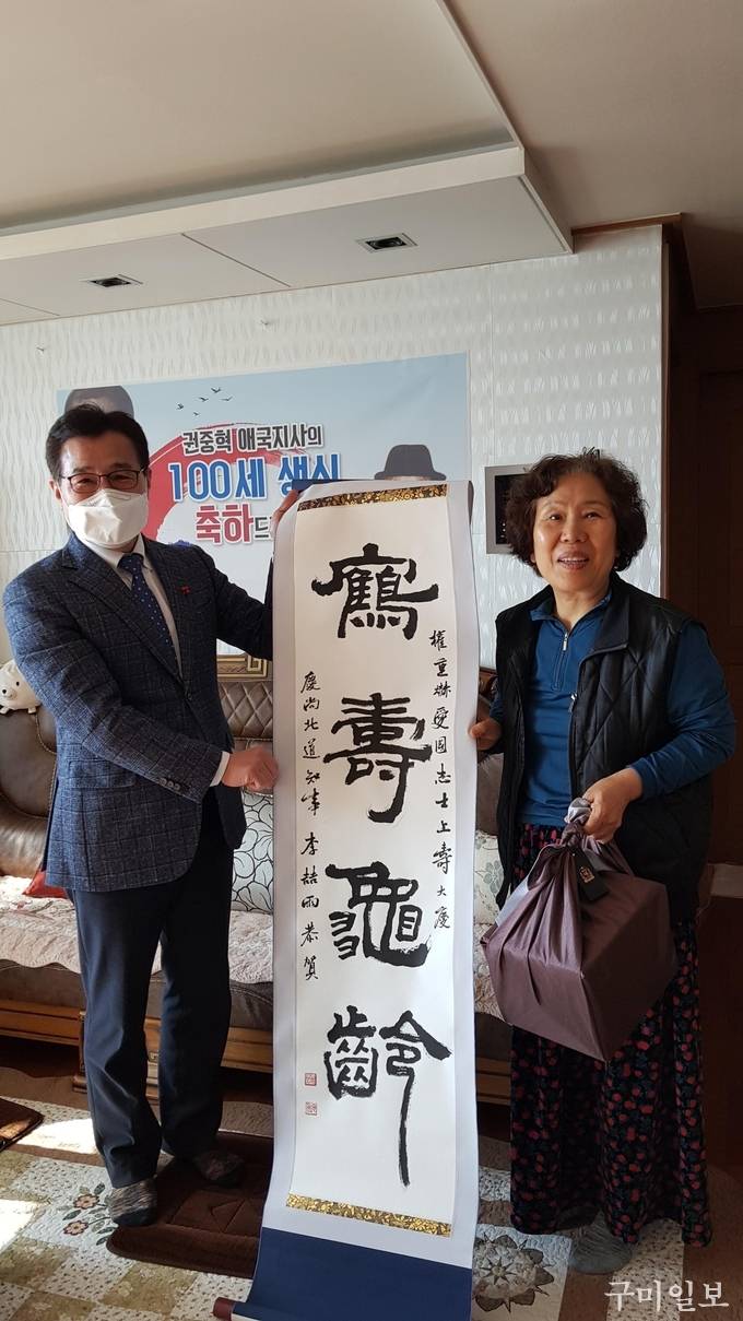 경상북도는 100세 생일을 맞이하는 권중혁 지사의 장수를 기원하는 ‘학수구령(鶴壽龜齡)’의 메시지를 족자에 담아 전달하였으며, 장병하 지사에게도 다가오는 설을 맞아 건강을 기원하며 위문하였다.
